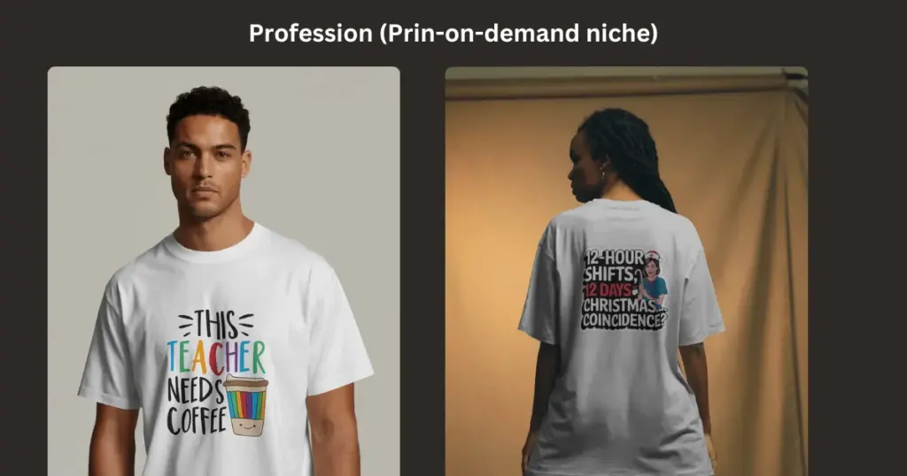 A strong design can sell in a crowded niche. A weak design won’t sell even in a low competition niche. Niche helps direction, but the good print-on-demand design idea with the message closes the sale.