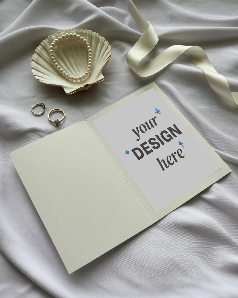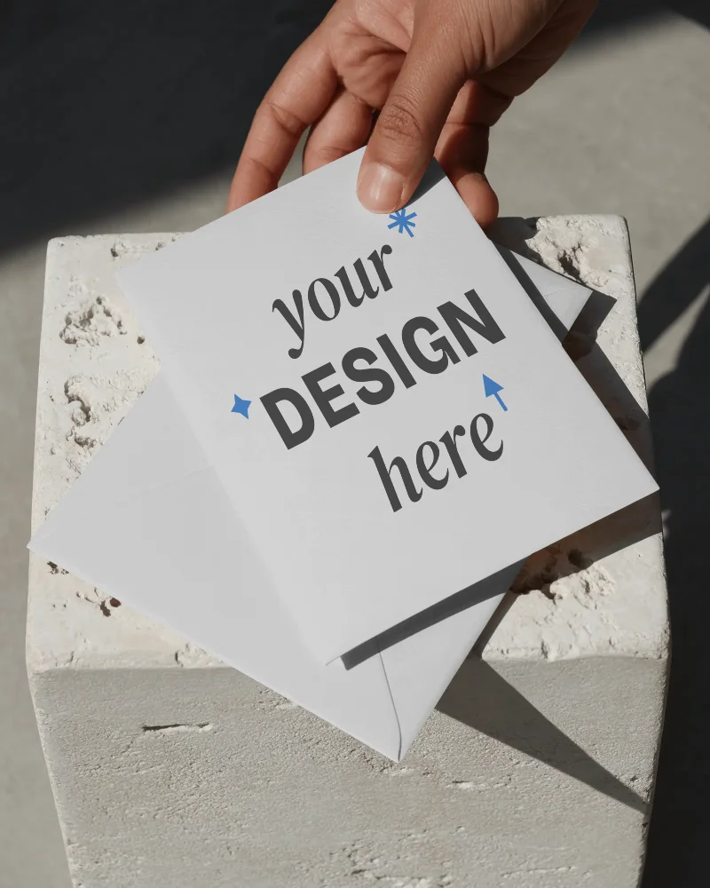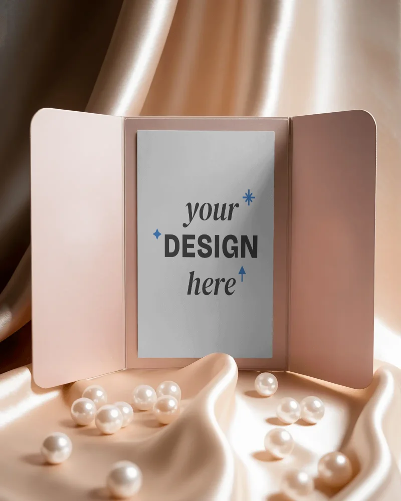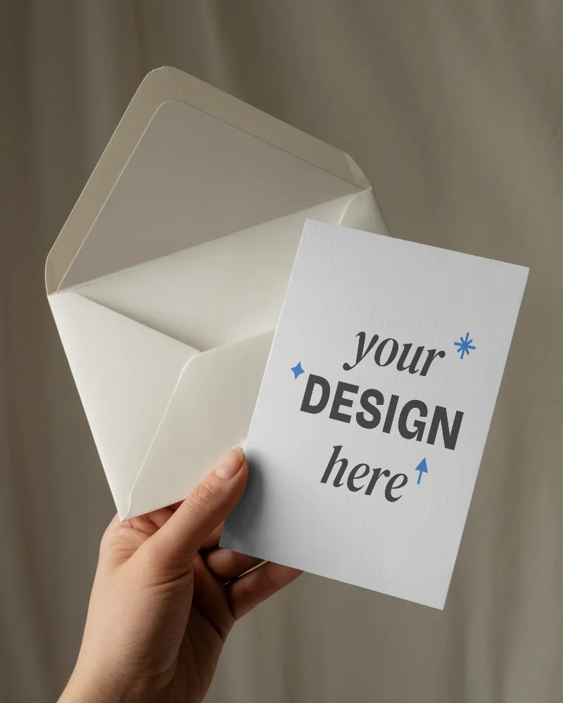 We’ve brought you an invitation mockup generator where you can create invitation mockups using templates for weddings, birthdays, anniversaries, and engagements. You’ll find styles like trifold and pocketfold invitations, shown being held in hand with envelopes or displayed on minimalist backgrounds. Easily adjust and change the colors of your design once it has been uploaded.